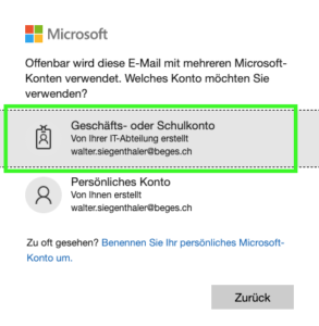 Falls ihr dann wieder auf dem alte Account landet und nicht untenstehende Frage gestellt werdet (hier Geschäfts- oder Schulkonto wählen), könnt ihr